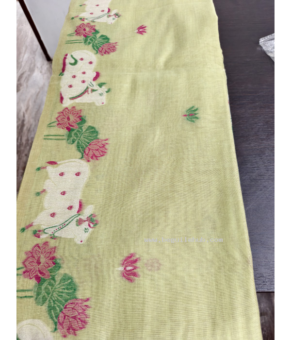 Tags: Light green cotton saree, Fancy cotton saree, Pichwai Jamdani saree, Jamdani work saree, Designer cotton saree, Cotton saree with blouse, Traditional Jamdani saree, Lightweight festive saree