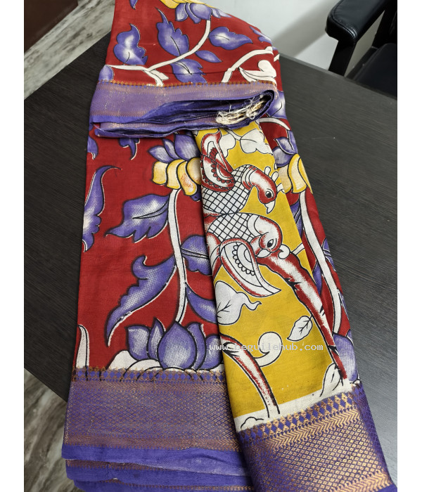 Tags: Dark maroon Kalamkari saree, Kalamkari saree with peacock pallu, Purple zari border saree, Designer Kalamkari saree, Traditional Kalamkari silk cotton saree, Kalamkari saree with blouse, Festive wear saree, Peacock design saree