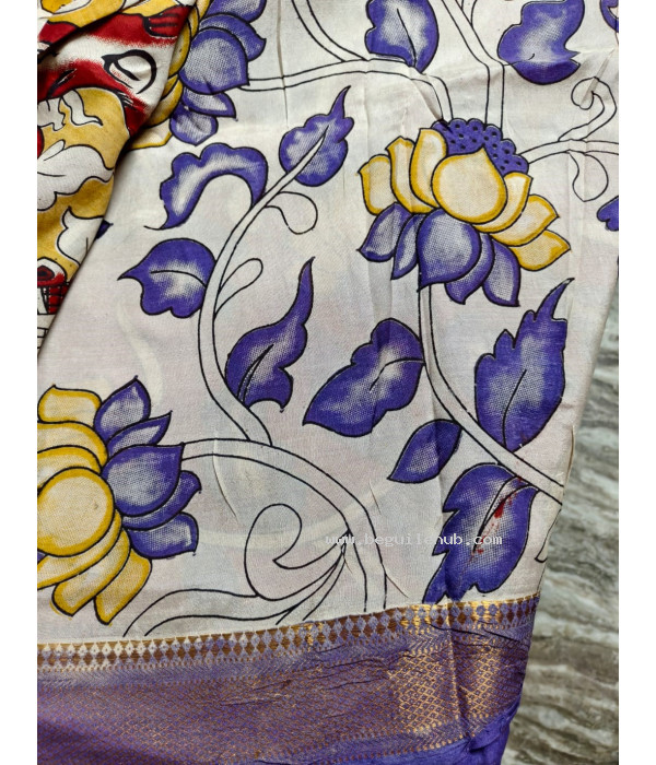 Elegant Purple Kalamkari saree featuring beautiful butterflies and rich broad silver zari borders on..