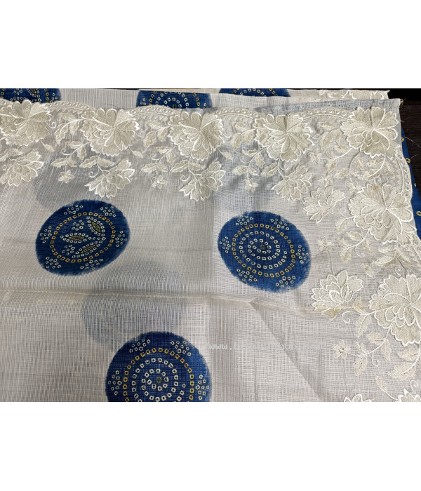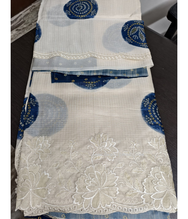 Beautiful off-white Kota saree featuring classic Bandini print and elegant embroidery on the borders for a refined traditional look.