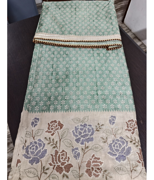 Beautiful Light Green Tussar Saree adorned with elegant block printing, rich embroidered borders, and a stylish striped pallu. The saree features delicate embroidery all along the borders, adding a refined designer touch.