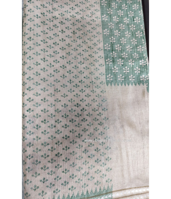 Designer Light Green Tussar Saree with Block Print, Embroidered Borders & Striped Pallu - FS267