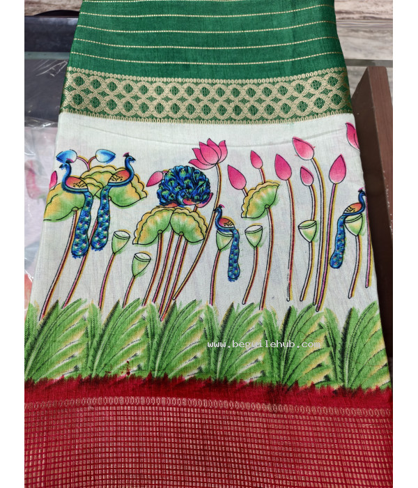 Stunning Green Soft Silk Saree featuring rich Red Zari borders on both sides for a classic and luxurious look.