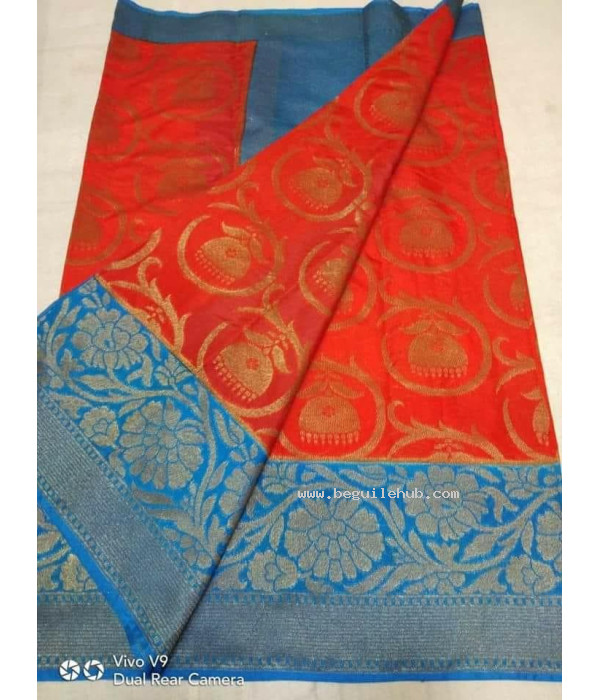 Red and blue linen silk benaras saree - 0018